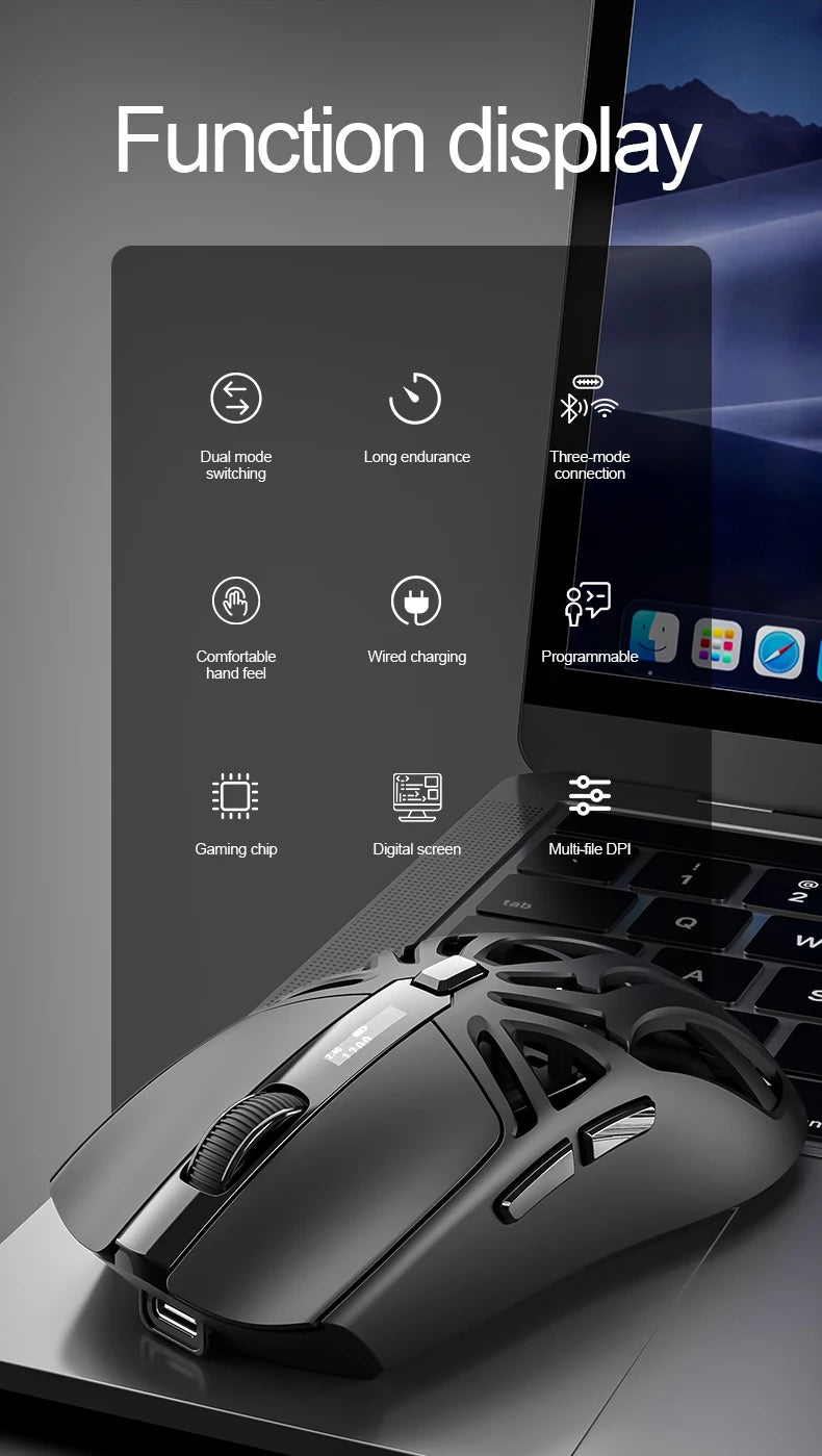 Découvrez la souris gaming sans fil SMAILWOLF RS8 avec son écran digital unique affichant le niveau de batterie et les DPI en temps réel. Ultra-légère à seulement 73g, cette souris tri-mode offre jusqu'à 10 000 DPI, un polling rate de 1000Hz et des macros programmables pour une expérience gaming professionnelle.